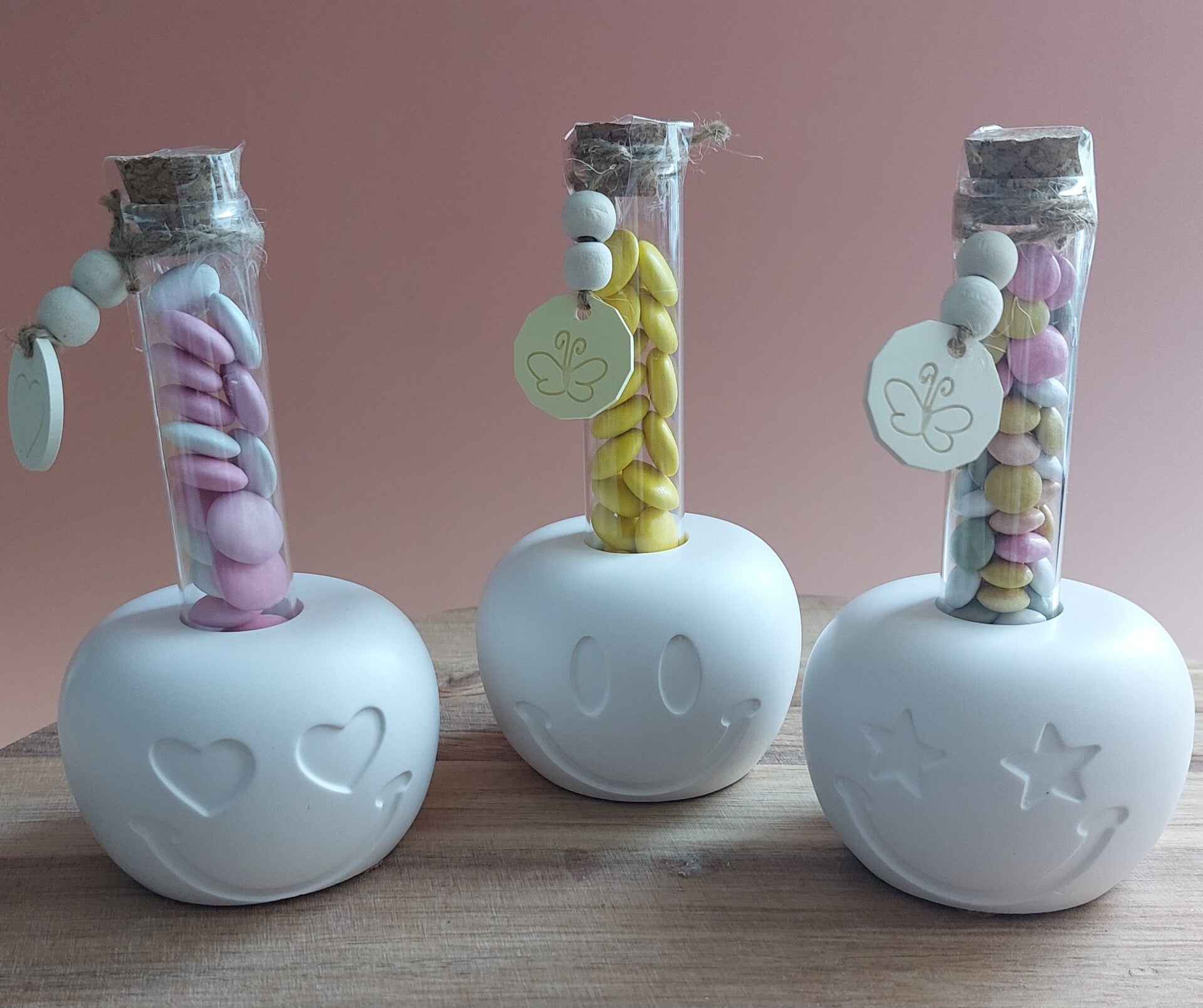 Super leuke en toffe smiley's met een glazen vaasje gevuld met smarties.